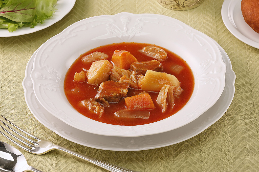 野菜(キャベツ(国産)、じゃがいも(国産)、たまねぎ(国産)、にんじん)、牛肉、トマトペースト、ビーツペースト、食塩、ラード、砂糖、ビーフブロス、ガーリック、醸造酢、香辛料、ナチュラルチーズ/調味料(アミノ酸等)、(一部に乳成分・牛肉・大豆・鶏肉を含む) ※本品の製造工場では、特定原材料のうち、えび、かに、小麦、卵、落花生を含む製品を生産しています。